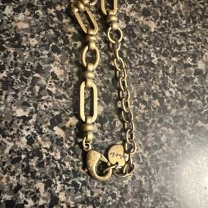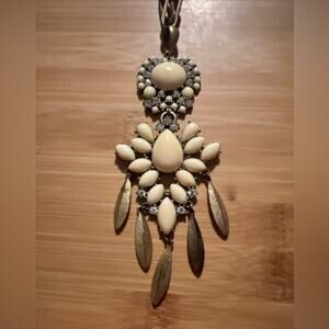This is a retired Stella & Dot necklace in gold tone with a Mallorca chandelier pendant design. The necklace features a long chain and a white main stone color. It has a statement style with a bohemian theme, making it a bold and eye-catching piece of fashion jewelry.