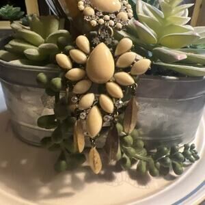 This stunning statement necklace features a blend of gold and cream tones, perfect for adding a touch of elegance to any outfit. The intricate design and high-quality materials make it a must-have accessory.
