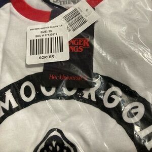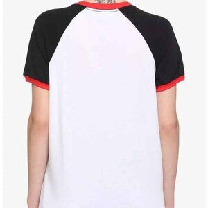 Ready to take down more Demogorgons with the gang? Enter the Upside Down in style with this raglan tee! From the newest season of Stranger Things, this raglan top features "Demogorgon Hunter" on the front, with a Demogorgon in the center and sandwiched by weapons. Comes with contrast red trim.