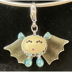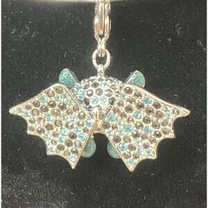 Adorable Swarovski bat charm featuring sparkling teal and black crystals, detailed enamel wings, and a sweet ivory face with pink accent. Silver-tone finish with secure lobster clasp, perfect for bracelets, necklaces, or Halloween accessories.