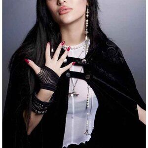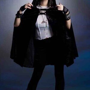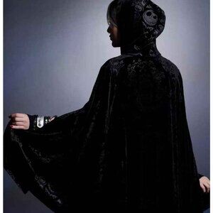 Look frightfully stylish while making Christmas in this The Nightmare Before Christmas cape! The black velvet features a design that highlights Jack's face, bones and filigree. Comes with a hood, arm slits and a double snap-button closure.