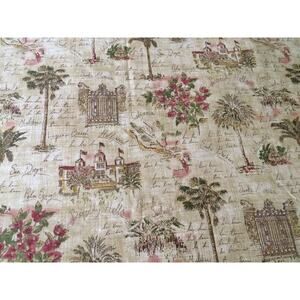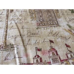1.8+ yards (uneven cut approximately 66") of 54" width Sunset Boulevard printed tea stained tan multicolor upholstery fabric by Waverly. 100% cotton. California towns, cities, and landmarks. Retired print!