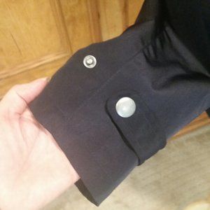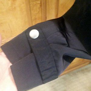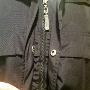 Beautifully made jacket, nice and light. Zipper and snap closure.