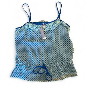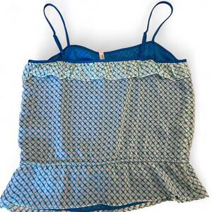 Retro 00s summer Blue and white ruffled cami top with blue trim. Size medium, no large imperfections. Thin fabric, see through. Has adjustable straps.