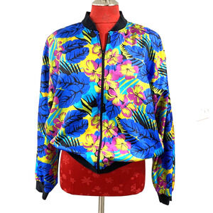 Retro 1980s silky bomber jacket with zip front, side seam pockets and stretch bands at the hem, cuffs and neckline. This lightweight jacket is tagged size 12 - Impressions of California - Made in USA - 100% polyester. Fantastic bright colors - unlined - feels like silk - style is classic 1980's boxy oversized design with shoulderpads. Gently worn - no flaws.