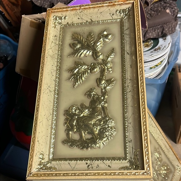 Elegant gold embossed wall art. Features a detailed design with a classic motif. Perfect for adding a touch of sophistication to any room.mid century