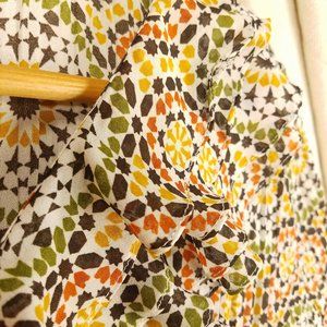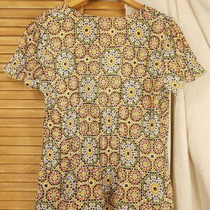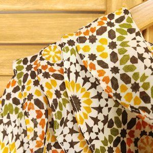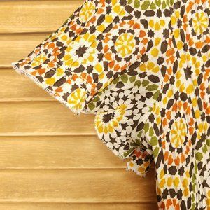 women's dress blouse, button down shirt, with ruffled neckline, mandala patterned, retro, hippy vibe, fall colors, rustic, mountain bohemian short sleeves, size L ❤