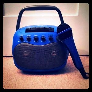 This retro karaoke machine is about 7.5 inches high and 8 inches across. It is lightly used and, since it is almost considered an antique, it has many older qualities. The only problem with it that I can find is that the cord to the microphone is somewhat speckled with white paint. Other than that it works pretty well. Comes with directions.