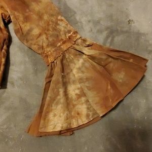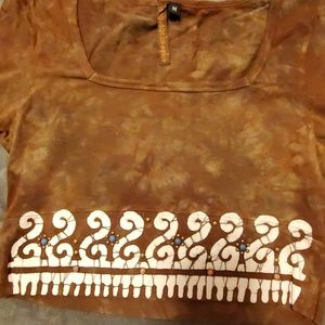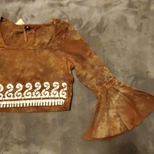 Brown tie-dyed Boho Language Los Angels crop top with flare detail sleeves. White, swirl screen print detail, with turquoise stud flowers. Originally purchased for $60 from a boutique in Breckenridge,CO -but worth $84 (as seen in last picture).