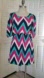 Fun, retro chevron print in bold 80s colors--navy, magenta (showing as hot pink in pics), cream and a mint green. Scoop neck dress with puff sleeves, half length to elbow. Elastic at waist and sleeves. Soft, stretchy fabric, bodice is lined. Bust 32" waist 26" length 33" GUC