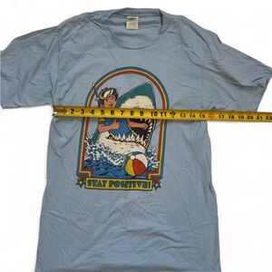 This light blue retro-style graphic tee gives major 80s vibes with its bold design and hilarious "Stay Positive" message featuring a shark. The perfect mix of ironic humor and vintage flair.
