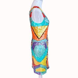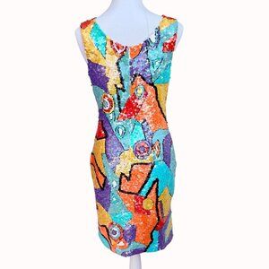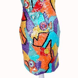 Retro 80s Sequin Patchwork of Abstract Geometric Swirls Dress Bodycon Size XS Vibrant Kaleidoscope Colorful Artistry By Daval Designs Designer Samir Suri Bold Glamour Party Fashion Summer Cruise Cocktail