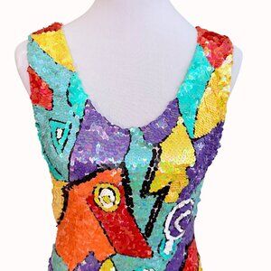 retro dress, 80s dress, party dress, geometric, patchwork dress, hand-beaded dress, colorful sequin dress, Daval Designs clothing, XS party dress, artistic evening dress, vibrant cocktail dress, unique formal wear, multicolor mini dress, bold fashion statement, handmade beaded apparel, Daval Designs XS, sleeveless sequin dress, women's artistic dress, abstract, swirls, crazy colors, cocktail dress, eveningwear dress, summer dress, cruise fashion, womens fashion, mini dress, bodycon dress