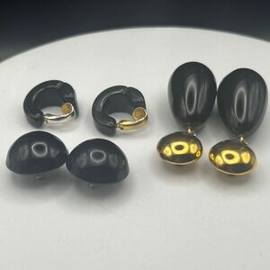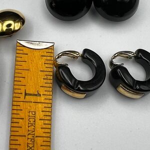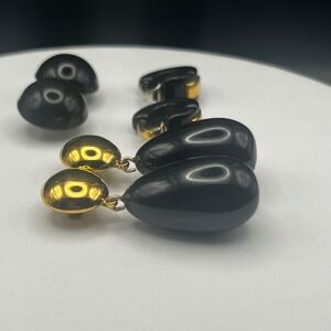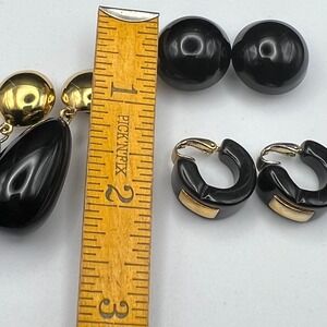 Stylish lot of 3 pairs of earrings in black and gold tones. Includes bold drop dangles, classic dome studs, and chunky hoops. Great for costume jewelry lovers, retro fashion, or statement accessorizing.