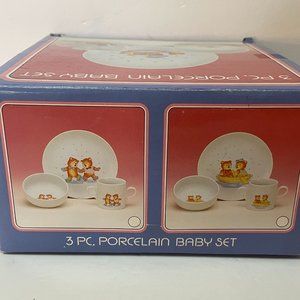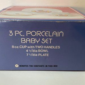3 Piece Porcelain Baby Set from 1990. This Japan made set is perfect for your little one's 1st Birthday, 1st Christmas, or 1st Special Event! Perfect for weddings, or any event where plasticware isn't perfect.