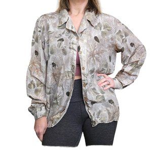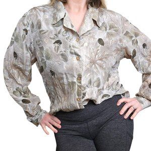Retro 90s M/L Silk Cream Nature Leaf Print Button Up Blouse Longsleeve Top Shirt