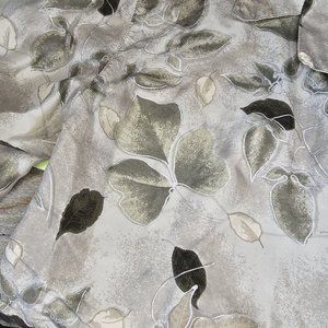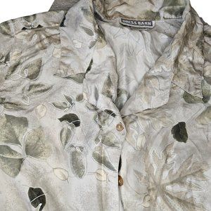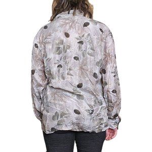 Add a touch of retro charm to your wardrobe with this M/L silk blouse from Dressbarn. Featuring a beautiful nature-inspired leaf print in neutral ivory, this button-up top is perfect for both casual and business occasions. The relaxed fit and long sleeves with casual sleeves make it an ideal choice for any season. Muted tones with silver outline on leaves.