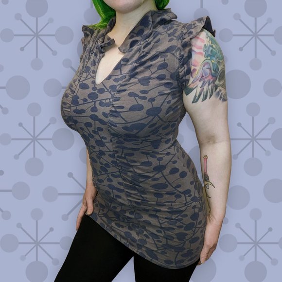 Retro Atomic Geometric Pattern Top - Ruffle Sleeves, Ruched Torso