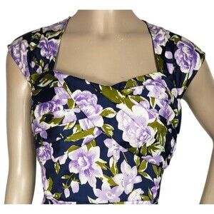 keywords: retro, floral, sexy, pinup, rockabilly, VLV, purple, blue, feminine, rare, hard to find, stretch, keyhole, cutout, queen anne neckline, pleated, ruched, gathered, flattering, slimming, 40s, 50s, vintage fashion, bombshell,