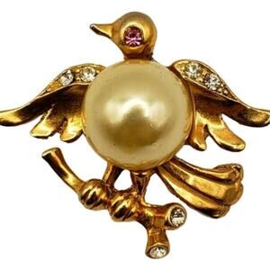 This charming vintage brooch features a whimsical gold tone bird perched on a branch, its body formed by a luminous faux pearl. Sparkling rhinestone accents on the wings, tail, and eye add a touch of glamour to this small but statement-making pin. Perfect for bird lovers, collectors of whimsical vintage jewelry, or as a sweet accessory for lapels, hats, or scarves, this brooch brings a touch of retro charm to any outfit. Lovely, petite brooch with a pink rhinestone eye, clear rhinestone accents on the wings and branch. Unsigned.
