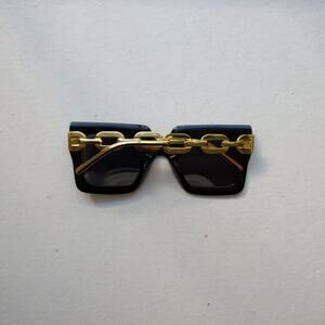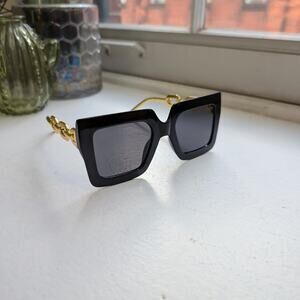 Love these gorgeous retro classic black chunky square festival shades! 70s rock and roll chic does Y2K bratz girlie vibes. All black tinted lenses give an excellent incognito look. Chunky gold chain details. Lightweight sturdy plastic frames and lenses. Super chic, tint is light enough to be worn inside and at night. Minimal clean look, comfortable plastic no snag nosepiece. New without tags.