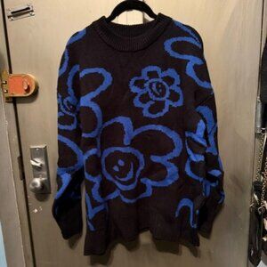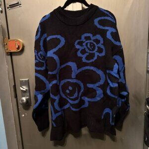 Retro Blue & Black floral & Smiley Face sweater - NWT