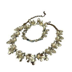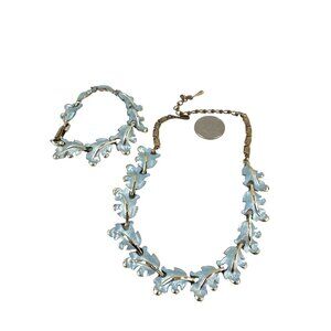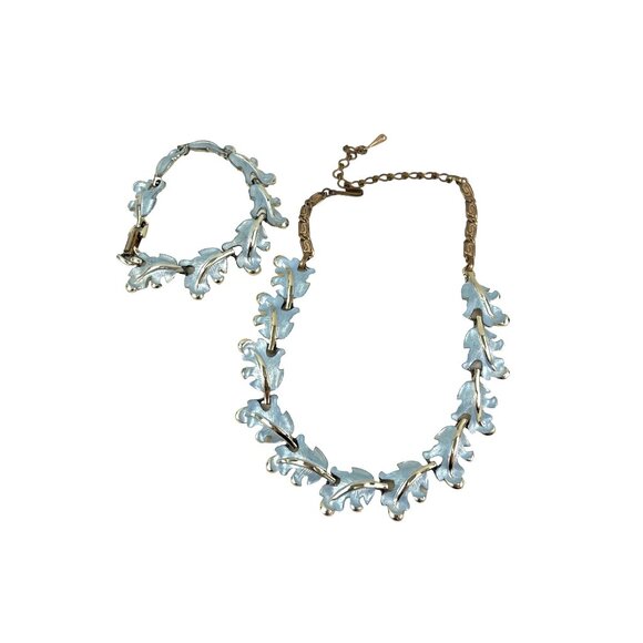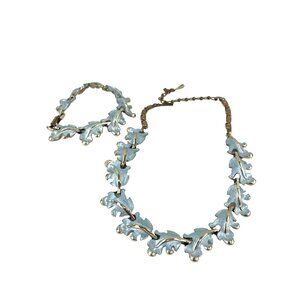 Retro Blue Leaf Enamel Necklace and Bracelet Set Parure 1950s