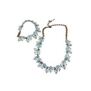 This exquisite vintage jewelry set features a delicate blue leaf design, adding a touch of elegance and nostalgia to any ensemble. The set includes a necklace and a bracelet, both intricately crafted with attention to detail. The chain is adjustable, ensuring a comfortable fit. Ideal for those who appreciate timeless, unique accessories.