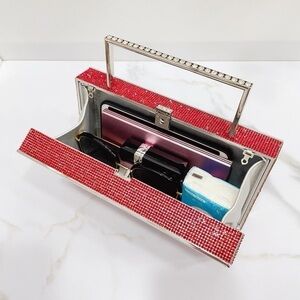 stylish retro boombox .Featuring a vibrant red and blue rhinestone design. Its unique look