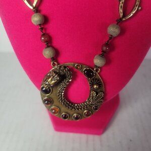 This necklace combines artistry and craftsmanship with its intricate bronze dragon pendant, earthy wooden beads, and gem accents. Its adjustable chain ensures versatile wear.