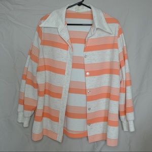 Orange and white striped button up, with cool retro collar. Can be worn oversized or fitted! Love to wear this with mom jeans and simple tank top.
