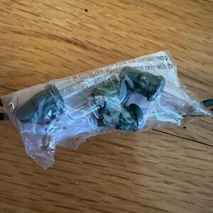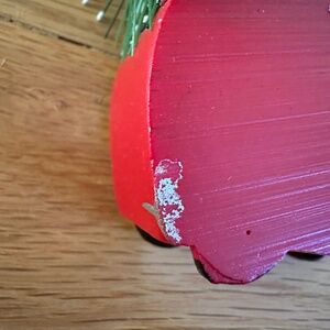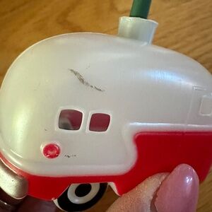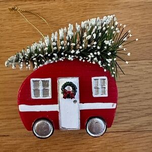 Retro Camper Travel Trailer Light Strand and Camper Ornament. Strand of 10 lights with 9 camper light covers (one of the light covers is missing,) All lights are in working order and replacement bulbs are attached. Plastic camper trailers are spaced 8" apart. There is a 24" lead from the plug to the first camper and a second strand of lights can be plugged into a connector at the opposite end. It measures 8" from the last camper. No cracks or chips in the coverings. Two campers have a mark on the white top of the trailer (pics 8,9.) Coordinating retro travel trailer ornament with a door wreath and wire brush Christmas tree on top is included. The ornament looks like it's made of wood but it is a dense stone like material. It will not break. Silver paint smear on back bottom left of the ornament (last pic.)