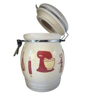 Retro Ceramic Kitchen Canister Hinged Lid Gasket Baking Pattern White Yellow Red