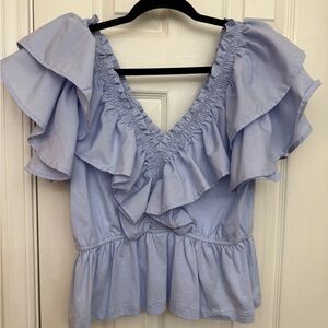 Chic and stylish ruffled top. Soft blue hue. Perfect for casual outings.