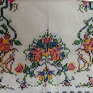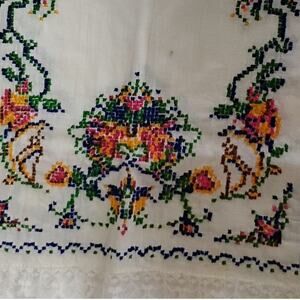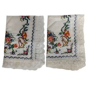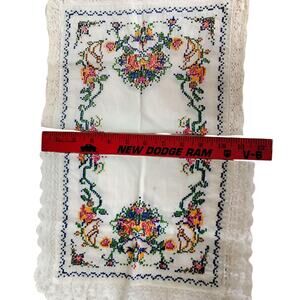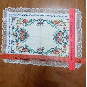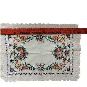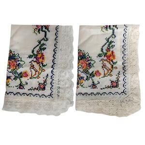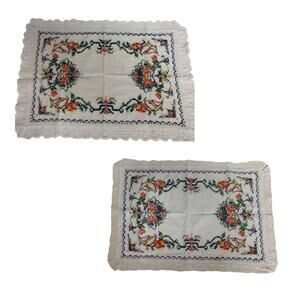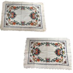 Bring cozy vintage charm to your holiday home! These two handmade cross-stitch doilies feature vibrant floral and Christmas tree motifs stitched on flour sack fabric with mismatched lace trim. Crafted by hand in the 1940s–60s, they’re perfect as table scarves, mantle accents, or framed wall art. A nostalgic heirloom for collectors and retro enthusiasts.