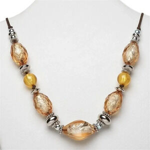 Unusual chunky acrylic beads necklace features orange - yellow beads in shades of amber, silver acrylic beads, and a faux suede cord with a lobster claw clasp closure.
