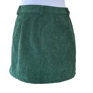 Dark green, corduroy, A-line mini skirt. 2 front pockets. Belt loops. Button, zip closure.