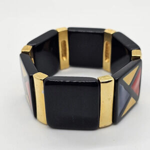 Yellow, Red, Blue, Black and Gold Tone Bracelet, Very 70's, Unsure of the maker or age. Appears gently used. Great statement piece for casual events or work in the office, maybe even costumes, etc.