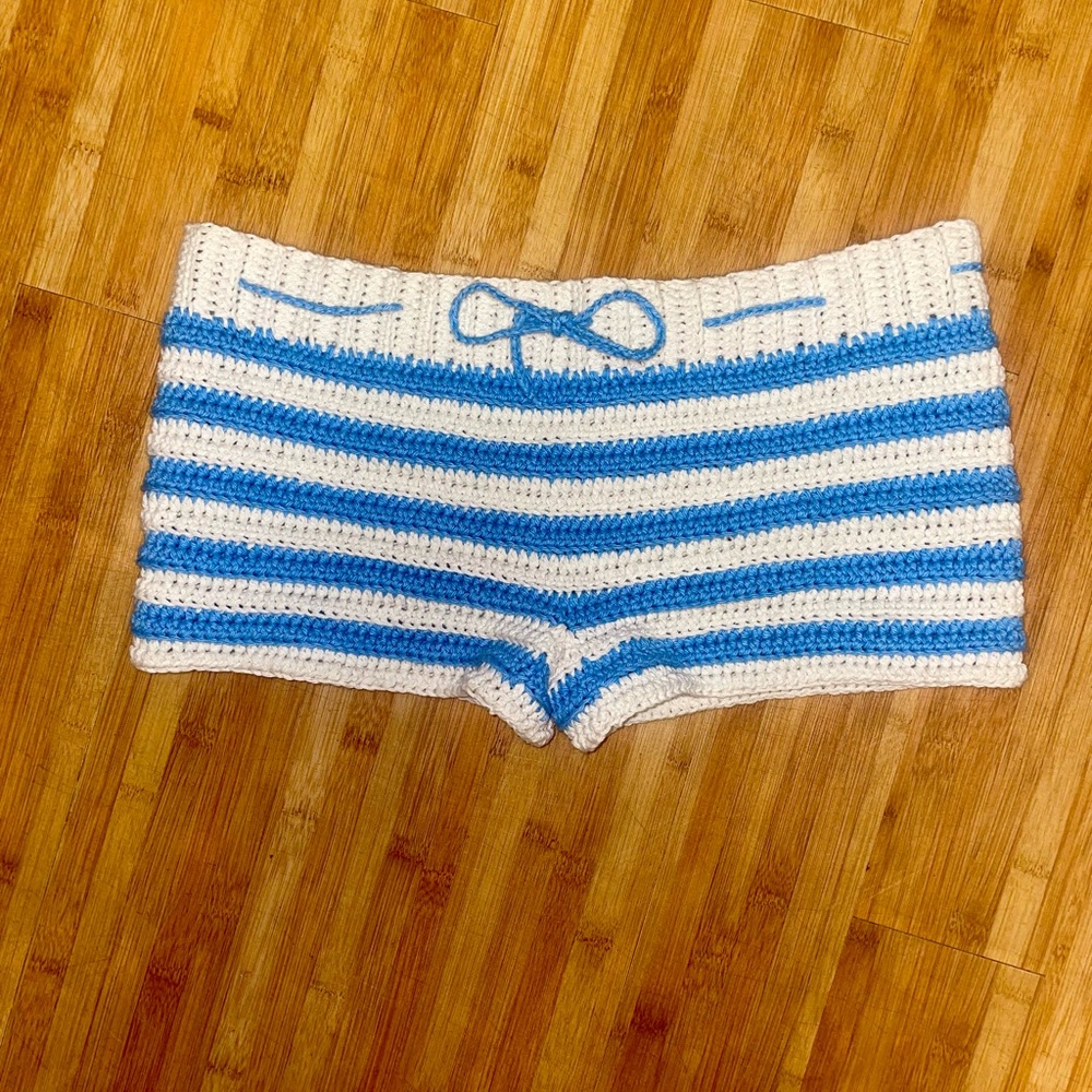 Handmade by me. Blue and white striped 100% cotton yarn. Machine washable, lay flat to dry. Functional draw string. Perfect for any casual occasion, could be dressed up or down. Fits size XS/M (Dm me for measurements)