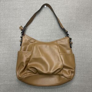 tan leatherette, slouchy bag, Y2K style, shoulder purse, buckle detail, vintage accessory, pocket details, distressed leather, casual tote, retro bag