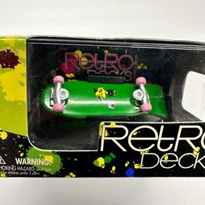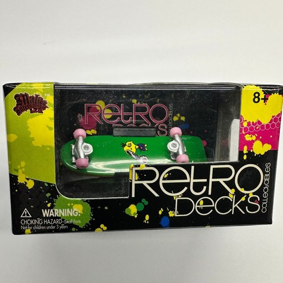 This Malibu International Retro Decks Collectibles Skateboard Fingerboard in green is new and sealed in the box. A couple of the edge flaps on the box are slightly damaged, visible in the pics.