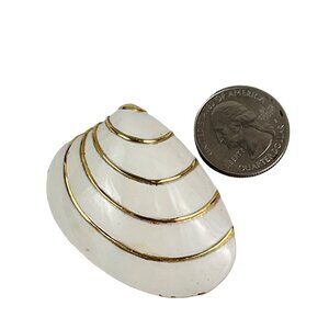 This vintage brooch, designed in the shape of a shell, showcases a classic white and gold color scheme. The metallic gold accents highlight its elegant curves, making it a timeless accessory. Ideal for adding a touch of sophistication to any ensemble, this brooch is a versatile piece for your collection.