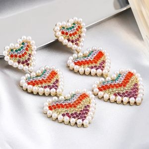 Retro Exaggerated multicolored crystal & pearl, 3 heart drop post earrings.