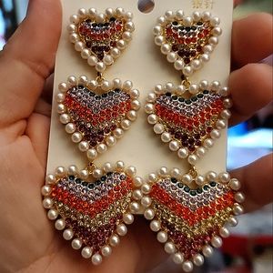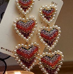Retro Exageratied multicolor crystal & white pearl, 3 heart drop post earrings. These are bold and sassy! Very eye-catching and sparkly. Beautiful colors & white pearls border the hearts. They have gold metal posts. Brand new and packaged.