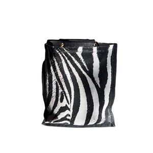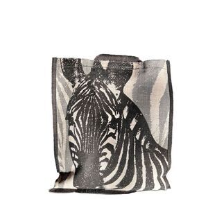 Beautiful weaved zebra tote featuring a black and white zebra with wavy gray tones with two wood handles tote/shoulder bag. Perfect for a day out shopping