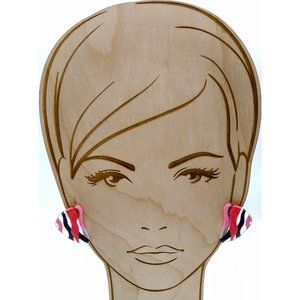 Retro Fab Lucite Striped Earrings, Clear Vintage Studs with Hot Pink and Black Wavy Strips of Color on Mod Shape