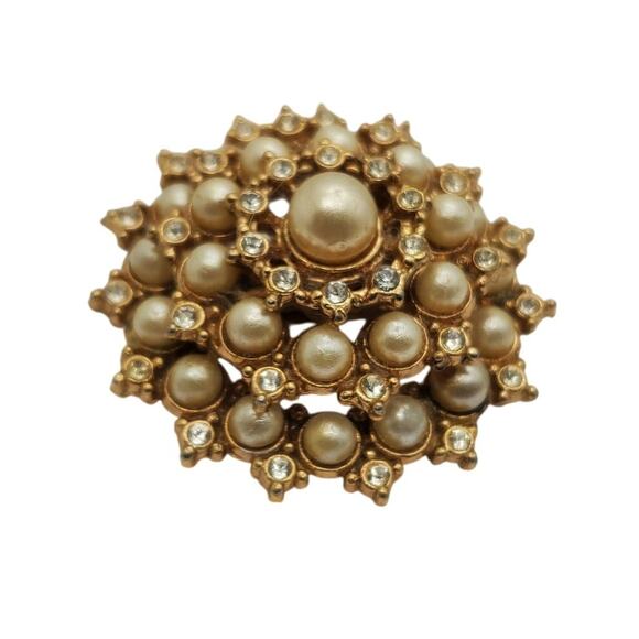 Retro Faux Pearl Brooch Cluster Pin Rhinestone Gold Tone Round Dome Shape Vtg