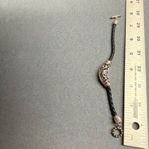 Retro Filigree Slider Bracelet 7.5 In Silver Braided Black Leather Toggle BoHo