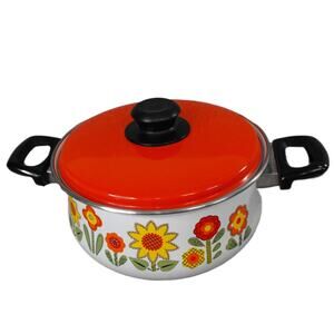 Charming unbranded retro-style enamel cook pot featuring a vibrant red lid and colorful floral design in yellow, orange, and green. Holds approx. 2 quarts. This nostalgic kitchenware piece is fully functional and display-worthy. Ideal for vintage kitchens, retro collectors, or cottagecore displays.