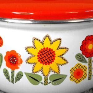 retro enamel pot, vintage cook pot, floral enamel cookware, cottagecore kitchen, flower pot with lid, 70s kitchenware, red lid pot, enamel saucepan, colorful vintage pot, unbranded retro pot